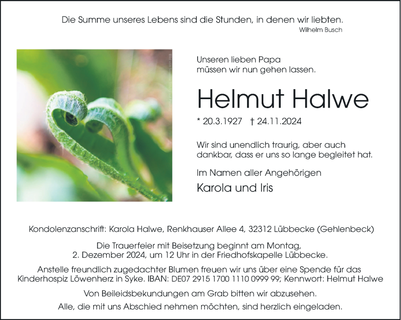 Hier finden Sie alle Traueranzeigen aus der Zeitung, die bisher für Helmut Halwe erschienen sind. Weitere Traueranzeigen, die in der Zeitung erscheinen, werden hier ebenfalls aufgelistet