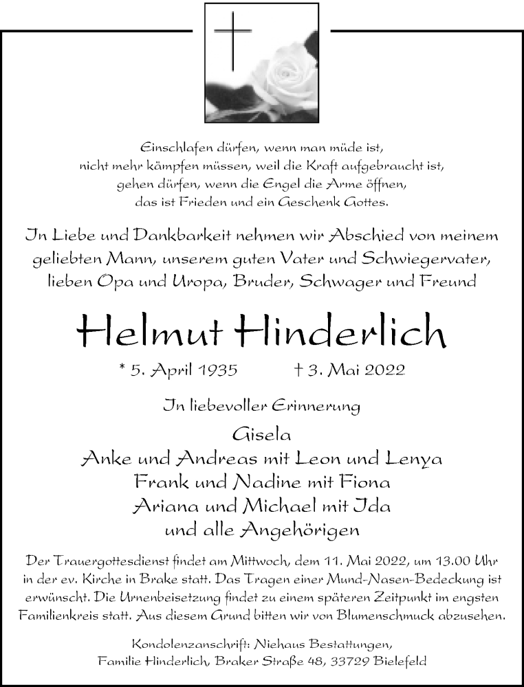 Hier finden Sie alle Traueranzeigen aus der Zeitung, die bisher für Helmut Hinderlich erschienen sind. Weitere Traueranzeigen, die in der Zeitung erscheinen, werden hier ebenfalls aufgelistet