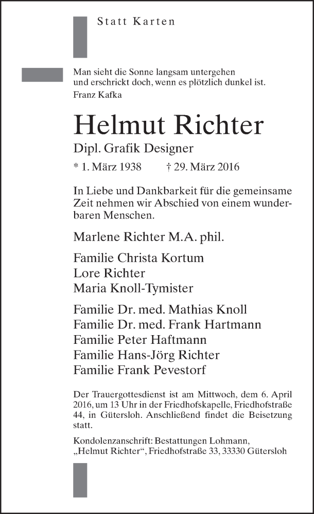 Hier finden Sie alle Traueranzeigen aus der Zeitung, die bisher für Helmut Richter erschienen sind. Weitere Traueranzeigen, die in der Zeitung erscheinen, werden hier ebenfalls aufgelistet