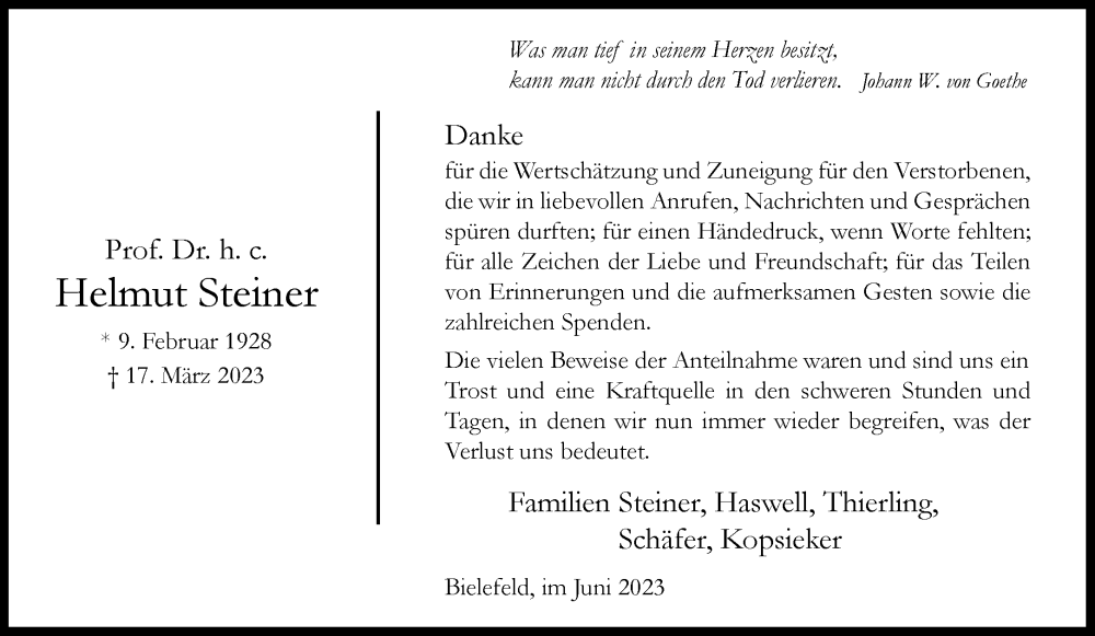 Hier finden Sie alle Traueranzeigen aus der Zeitung, die bisher für Helmut Steiner erschienen sind. Weitere Traueranzeigen, die in der Zeitung erscheinen, werden hier ebenfalls aufgelistet