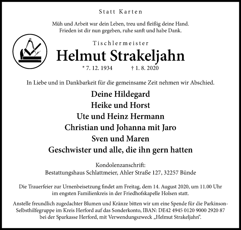 Hier finden Sie alle Traueranzeigen aus der Zeitung, die bisher für Helmut Strakeljahn erschienen sind. Weitere Traueranzeigen, die in der Zeitung erscheinen, werden hier ebenfalls aufgelistet