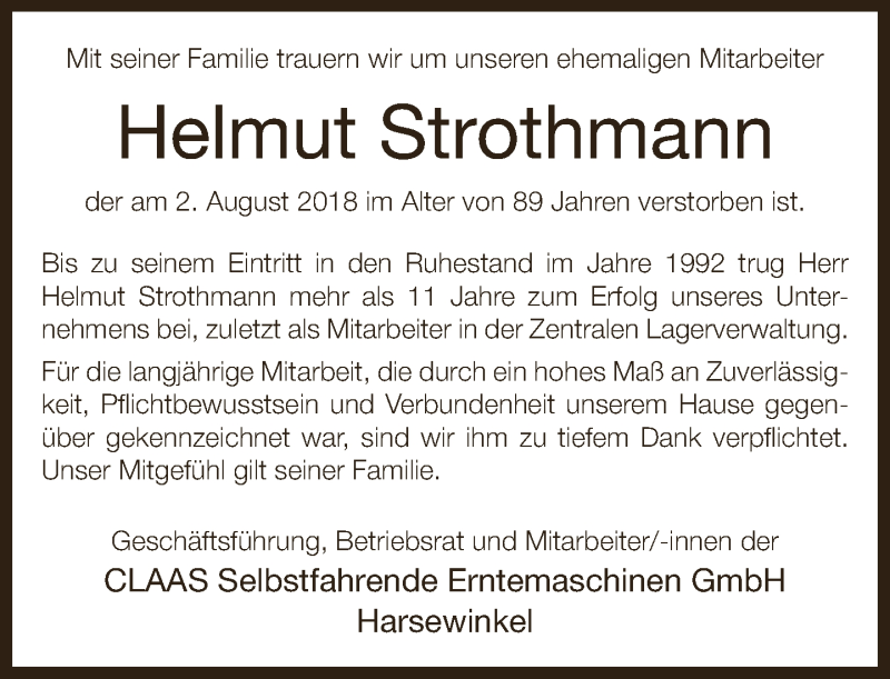 Hier finden Sie alle Traueranzeigen aus der Zeitung, die bisher für Helmut Strothmann erschienen sind. Weitere Traueranzeigen, die in der Zeitung erscheinen, werden hier ebenfalls aufgelistet
