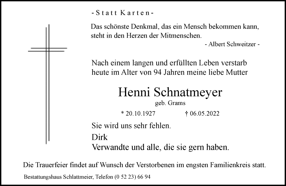 Hier finden Sie alle Traueranzeigen aus der Zeitung, die bisher für Henni Schnatmeyer erschienen sind. Weitere Traueranzeigen, die in der Zeitung erscheinen, werden hier ebenfalls aufgelistet