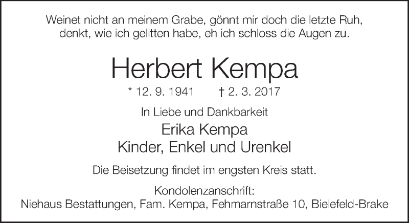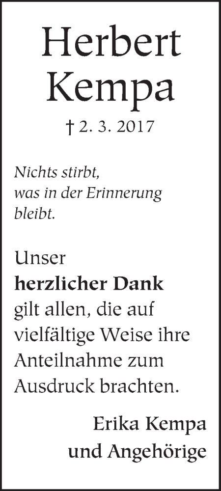 Hier finden Sie alle Traueranzeigen aus der Zeitung, die bisher für Herbert Kempa erschienen sind. Weitere Traueranzeigen, die in der Zeitung erscheinen, werden hier ebenfalls aufgelistet