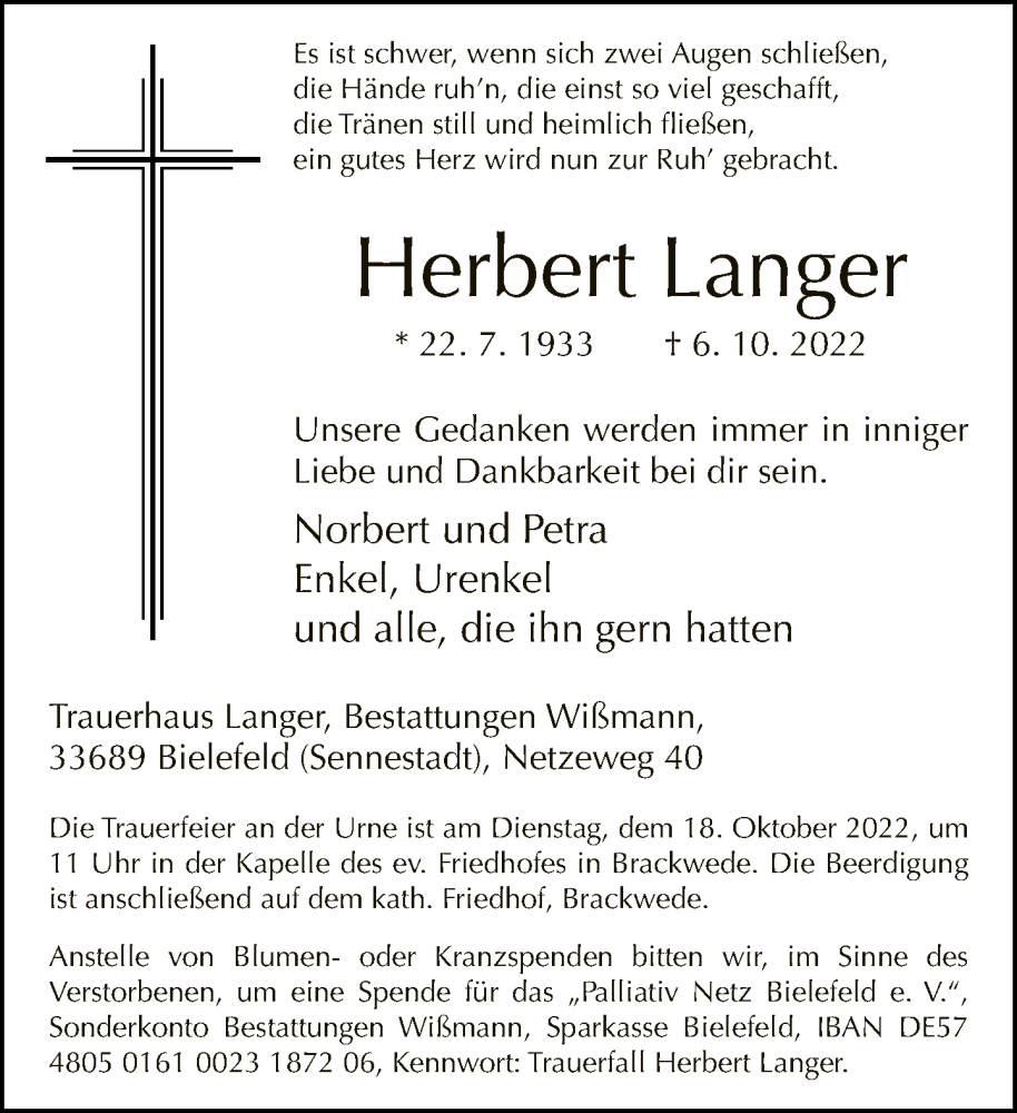 Hier finden Sie alle Traueranzeigen aus der Zeitung, die bisher für Herbert Langer erschienen sind. Weitere Traueranzeigen, die in der Zeitung erscheinen, werden hier ebenfalls aufgelistet