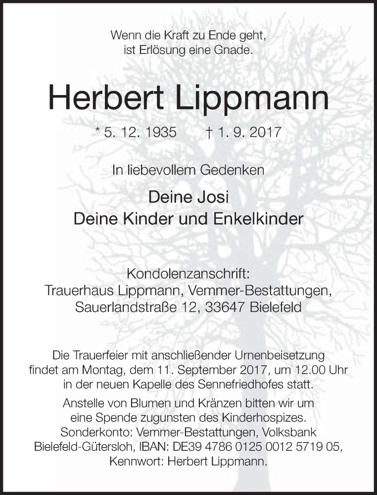 Hier finden Sie alle Traueranzeigen aus der Zeitung, die bisher für Herbert Lippmann erschienen sind. Weitere Traueranzeigen, die in der Zeitung erscheinen, werden hier ebenfalls aufgelistet