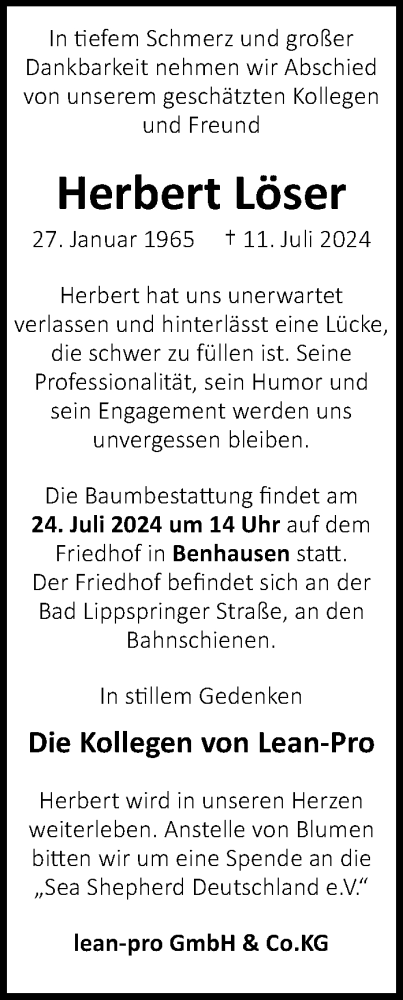 Hier finden Sie alle Traueranzeigen aus der Zeitung, die bisher für Herbert Löser erschienen sind. Weitere Traueranzeigen, die in der Zeitung erscheinen, werden hier ebenfalls aufgelistet