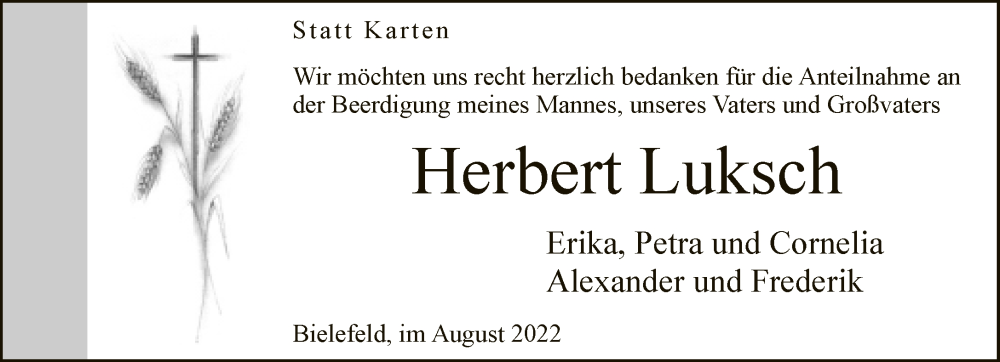 Hier finden Sie alle Traueranzeigen aus der Zeitung, die bisher für Herbert Luksch erschienen sind. Weitere Traueranzeigen, die in der Zeitung erscheinen, werden hier ebenfalls aufgelistet