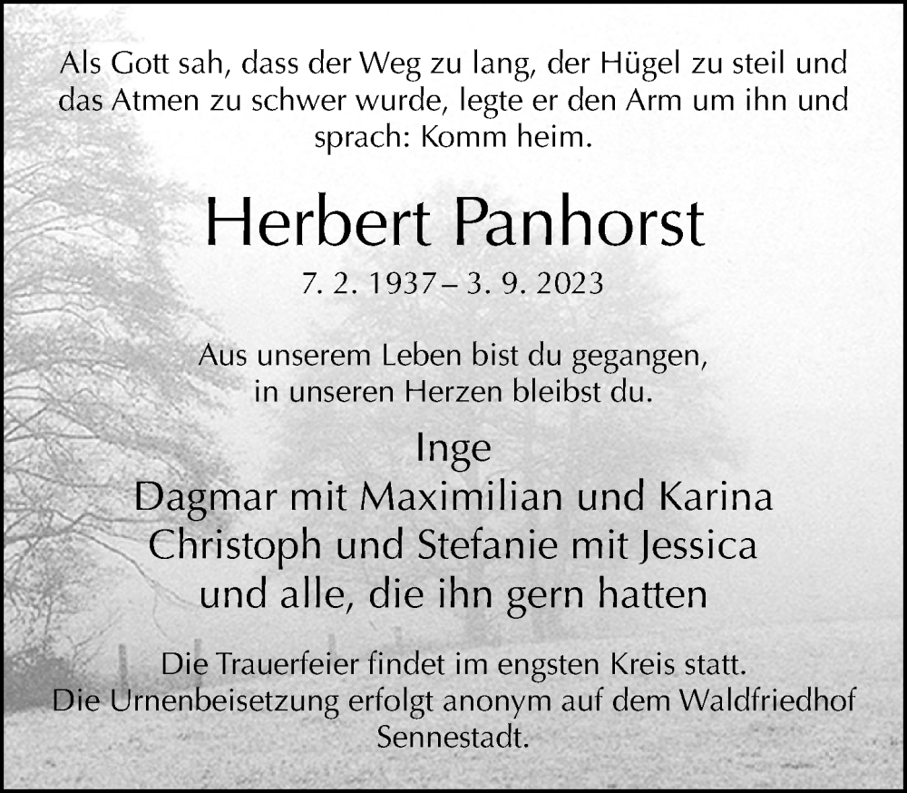Hier finden Sie alle Traueranzeigen aus der Zeitung, die bisher für Herbert Panhorst erschienen sind. Weitere Traueranzeigen, die in der Zeitung erscheinen, werden hier ebenfalls aufgelistet