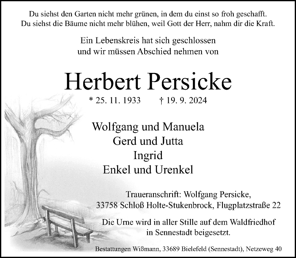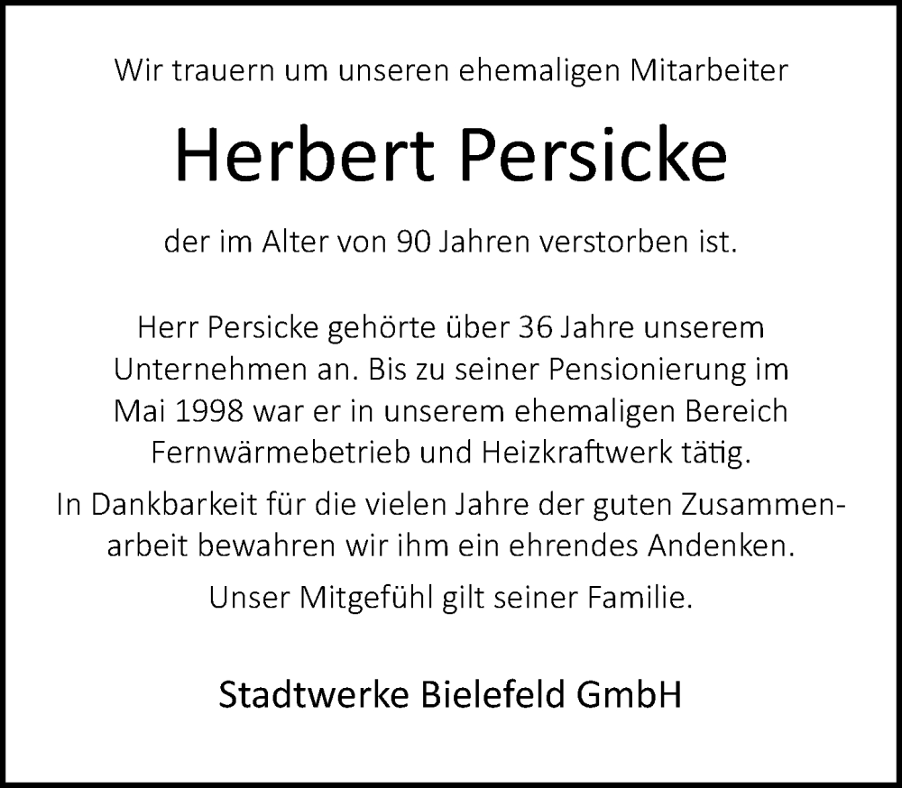 Hier finden Sie alle Traueranzeigen aus der Zeitung, die bisher für Herbert Persicke erschienen sind. Weitere Traueranzeigen, die in der Zeitung erscheinen, werden hier ebenfalls aufgelistet