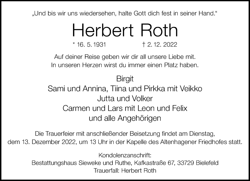 Hier finden Sie alle Traueranzeigen aus der Zeitung, die bisher für Herbert Roth erschienen sind. Weitere Traueranzeigen, die in der Zeitung erscheinen, werden hier ebenfalls aufgelistet