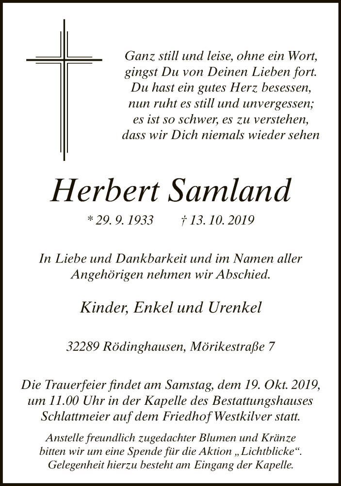 Hier finden Sie alle Traueranzeigen aus der Zeitung, die bisher für Herbert Samland erschienen sind. Weitere Traueranzeigen, die in der Zeitung erscheinen, werden hier ebenfalls aufgelistet