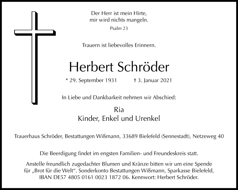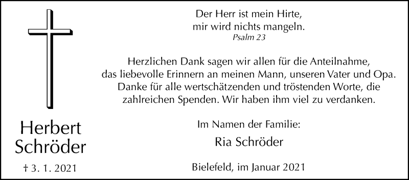 Hier finden Sie alle Traueranzeigen aus der Zeitung, die bisher für Herbert Schröder erschienen sind. Weitere Traueranzeigen, die in der Zeitung erscheinen, werden hier ebenfalls aufgelistet