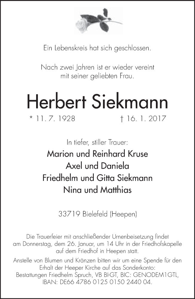 Hier finden Sie alle Traueranzeigen aus der Zeitung, die bisher für Herbert Siekmann erschienen sind. Weitere Traueranzeigen, die in der Zeitung erscheinen, werden hier ebenfalls aufgelistet