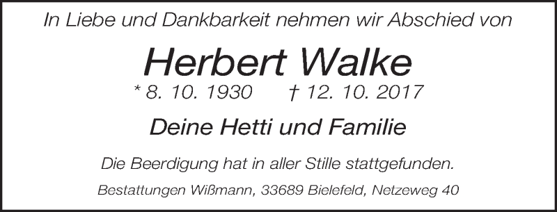 Hier finden Sie alle Traueranzeigen aus der Zeitung, die bisher für Herbert Walke erschienen sind. Weitere Traueranzeigen, die in der Zeitung erscheinen, werden hier ebenfalls aufgelistet