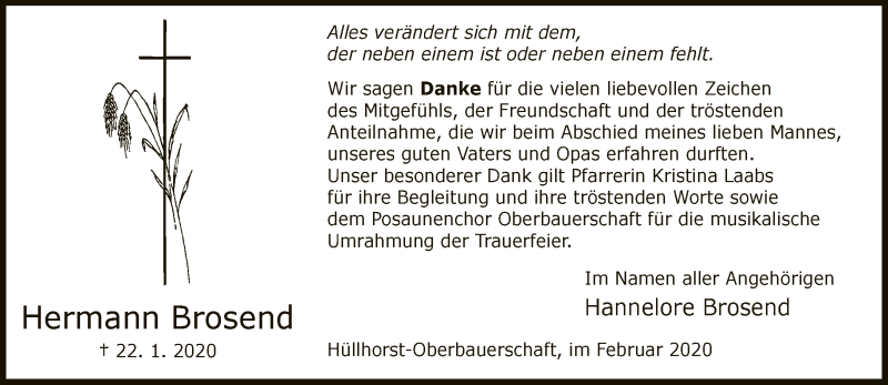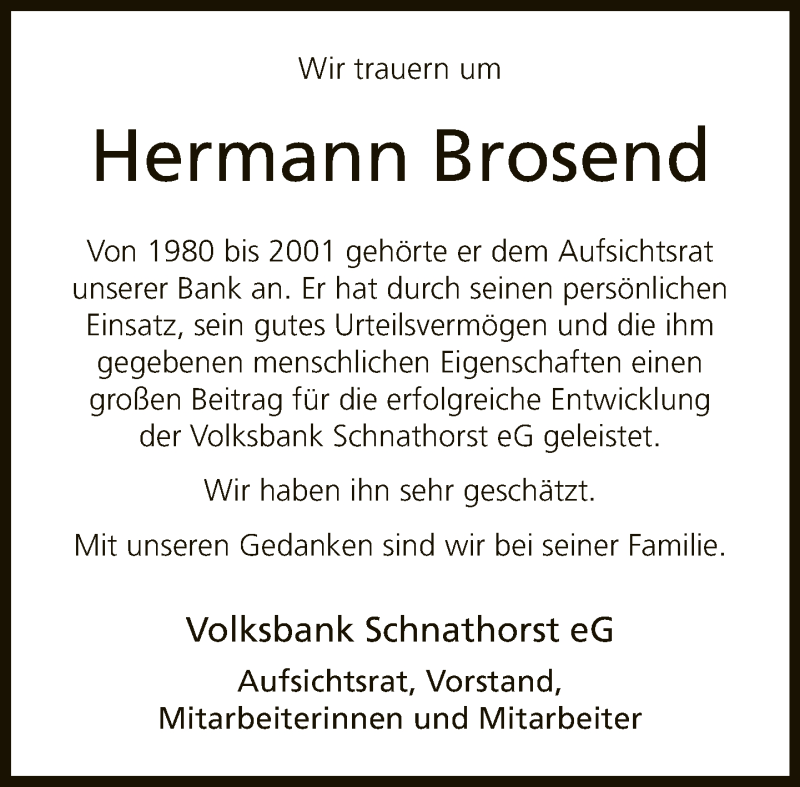Hier finden Sie alle Traueranzeigen aus der Zeitung, die bisher für Hermann Brosend erschienen sind. Weitere Traueranzeigen, die in der Zeitung erscheinen, werden hier ebenfalls aufgelistet