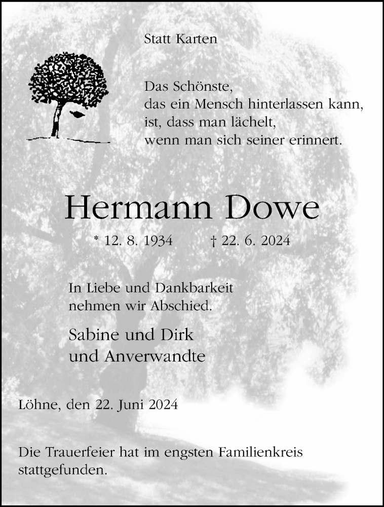 Hier finden Sie alle Traueranzeigen aus der Zeitung, die bisher für Hermann Dowe erschienen sind. Weitere Traueranzeigen, die in der Zeitung erscheinen, werden hier ebenfalls aufgelistet