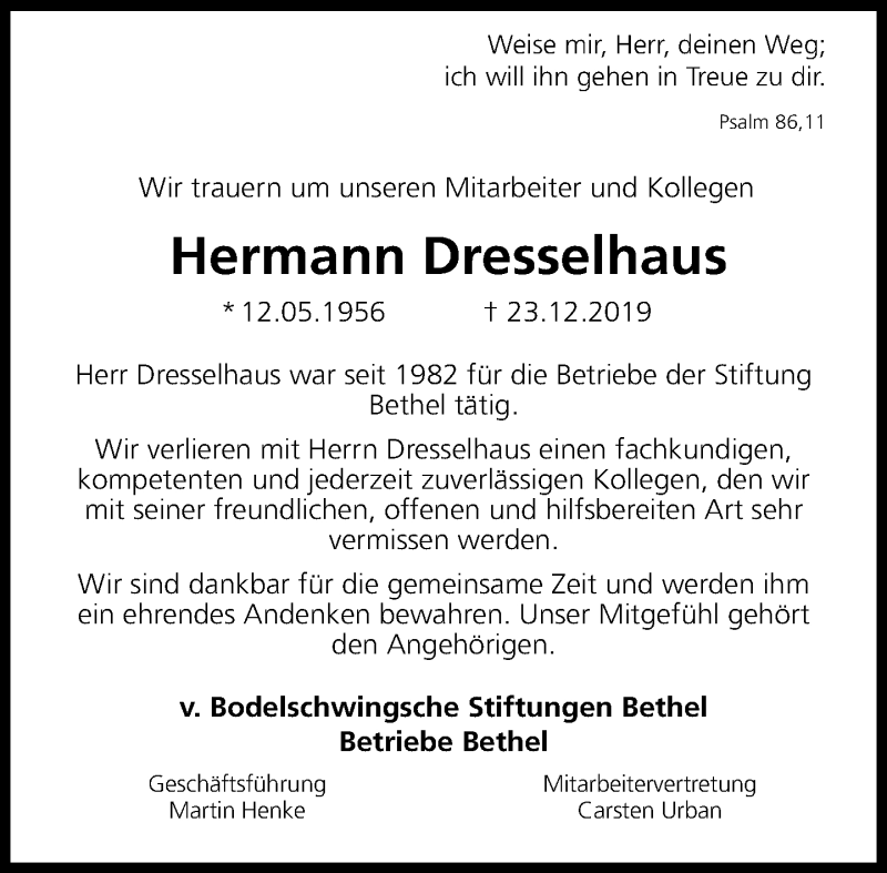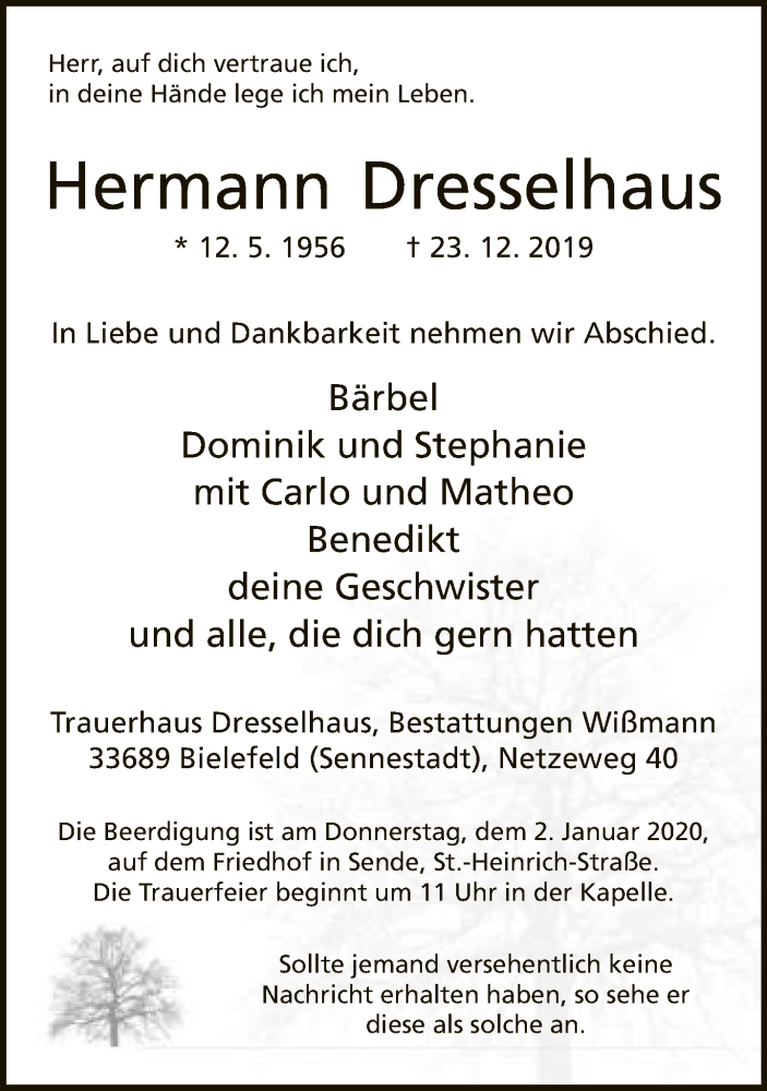Hier finden Sie alle Traueranzeigen aus der Zeitung, die bisher für Hermann Dresselhaus erschienen sind. Weitere Traueranzeigen, die in der Zeitung erscheinen, werden hier ebenfalls aufgelistet