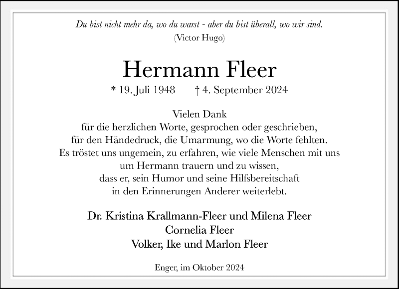 Hier finden Sie alle Traueranzeigen aus der Zeitung, die bisher für Hermann Fleer erschienen sind. Weitere Traueranzeigen, die in der Zeitung erscheinen, werden hier ebenfalls aufgelistet