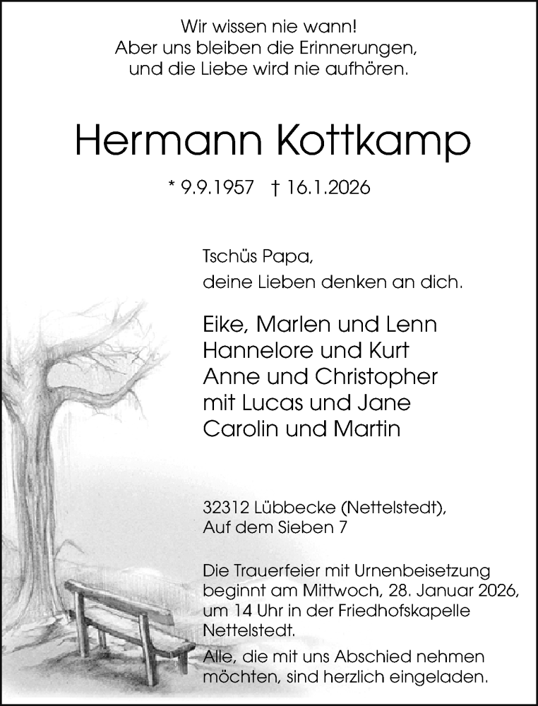 Hier finden Sie alle Traueranzeigen aus der Zeitung, die bisher für Hermann Kottkamp erschienen sind. Weitere Traueranzeigen, die in der Zeitung erscheinen, werden hier ebenfalls aufgelistet