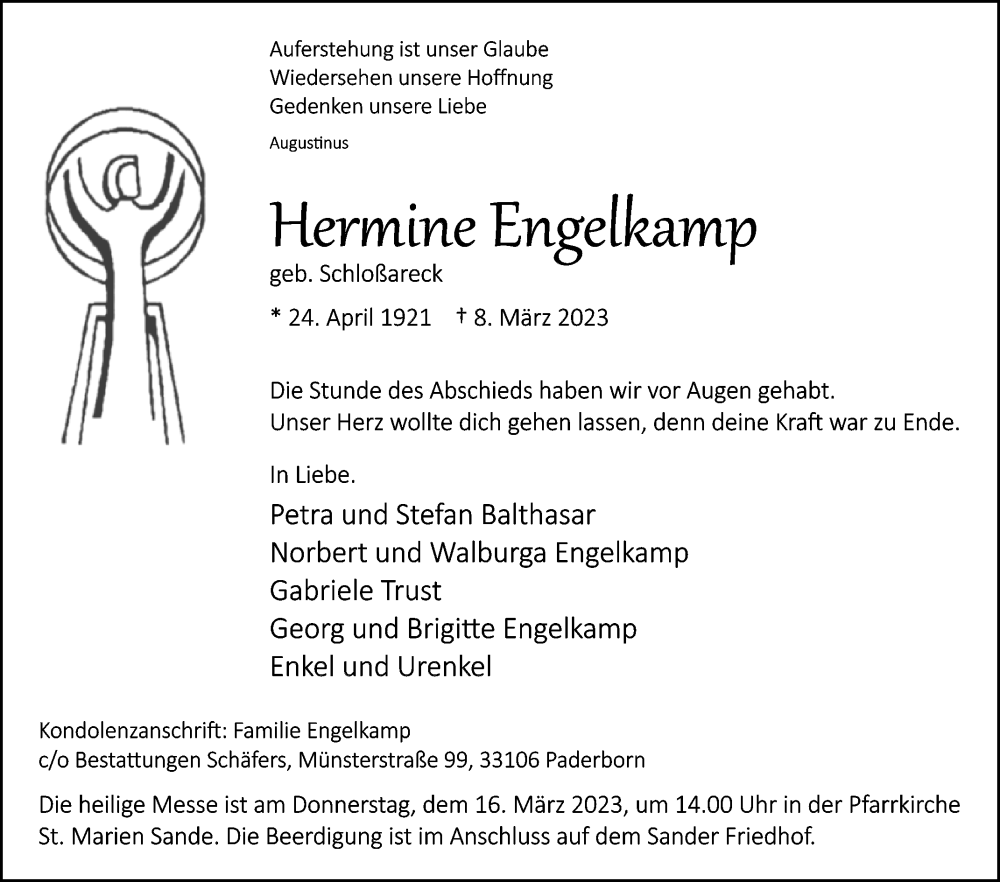 Hier finden Sie alle Traueranzeigen aus der Zeitung, die bisher für Hermine Engelkamp erschienen sind. Weitere Traueranzeigen, die in der Zeitung erscheinen, werden hier ebenfalls aufgelistet