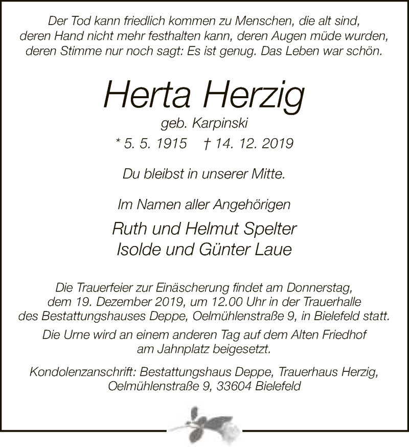 Hier finden Sie alle Traueranzeigen aus der Zeitung, die bisher für Herta Herzig erschienen sind. Weitere Traueranzeigen, die in der Zeitung erscheinen, werden hier ebenfalls aufgelistet