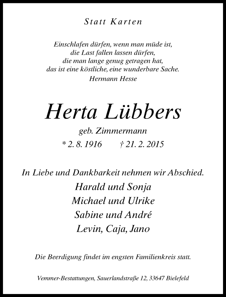 Hier finden Sie alle Traueranzeigen aus der Zeitung, die bisher für Herta Lübbers erschienen sind. Weitere Traueranzeigen, die in der Zeitung erscheinen, werden hier ebenfalls aufgelistet