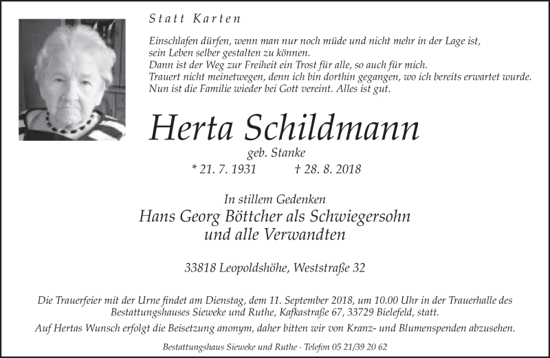 Hier finden Sie alle Traueranzeigen aus der Zeitung, die bisher für Herta Schildmann erschienen sind. Weitere Traueranzeigen, die in der Zeitung erscheinen, werden hier ebenfalls aufgelistet