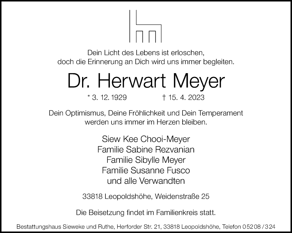 Hier finden Sie alle Traueranzeigen aus der Zeitung, die bisher für Herwart Meyer erschienen sind. Weitere Traueranzeigen, die in der Zeitung erscheinen, werden hier ebenfalls aufgelistet