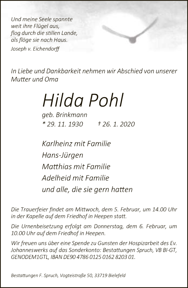 Hier finden Sie alle Traueranzeigen aus der Zeitung, die bisher für Hilda Pohl erschienen sind. Weitere Traueranzeigen, die in der Zeitung erscheinen, werden hier ebenfalls aufgelistet