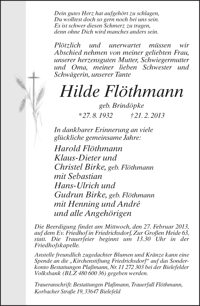 Hier finden Sie alle Traueranzeigen aus der Zeitung, die bisher für Hilde Flöthmann erschienen sind. Weitere Traueranzeigen, die in der Zeitung erscheinen, werden hier ebenfalls aufgelistet