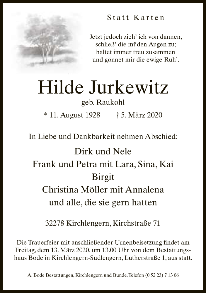 Hier finden Sie alle Traueranzeigen aus der Zeitung, die bisher für Hilde Jurkewitz erschienen sind. Weitere Traueranzeigen, die in der Zeitung erscheinen, werden hier ebenfalls aufgelistet