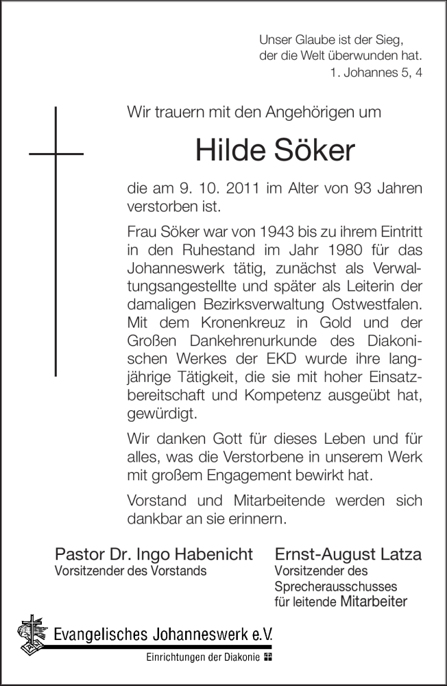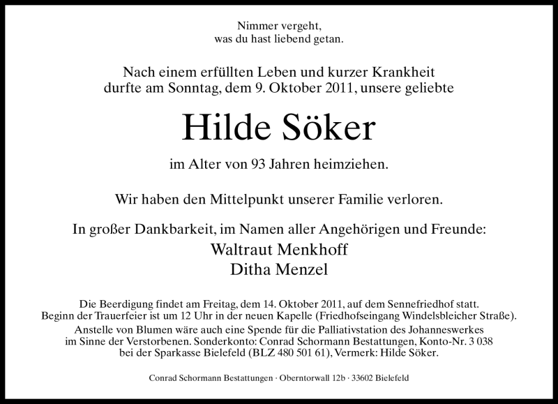 Hier finden Sie alle Traueranzeigen aus der Zeitung, die bisher für Hilde Söker erschienen sind. Weitere Traueranzeigen, die in der Zeitung erscheinen, werden hier ebenfalls aufgelistet
