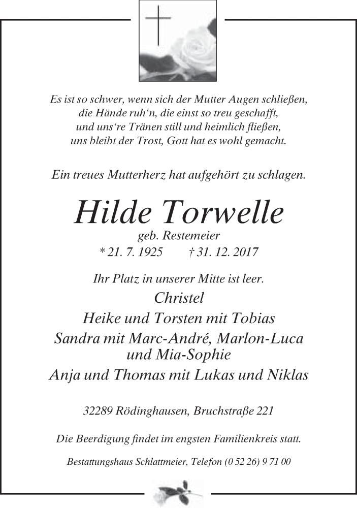 Hier finden Sie alle Traueranzeigen aus der Zeitung, die bisher für Hilde Torwelle erschienen sind. Weitere Traueranzeigen, die in der Zeitung erscheinen, werden hier ebenfalls aufgelistet