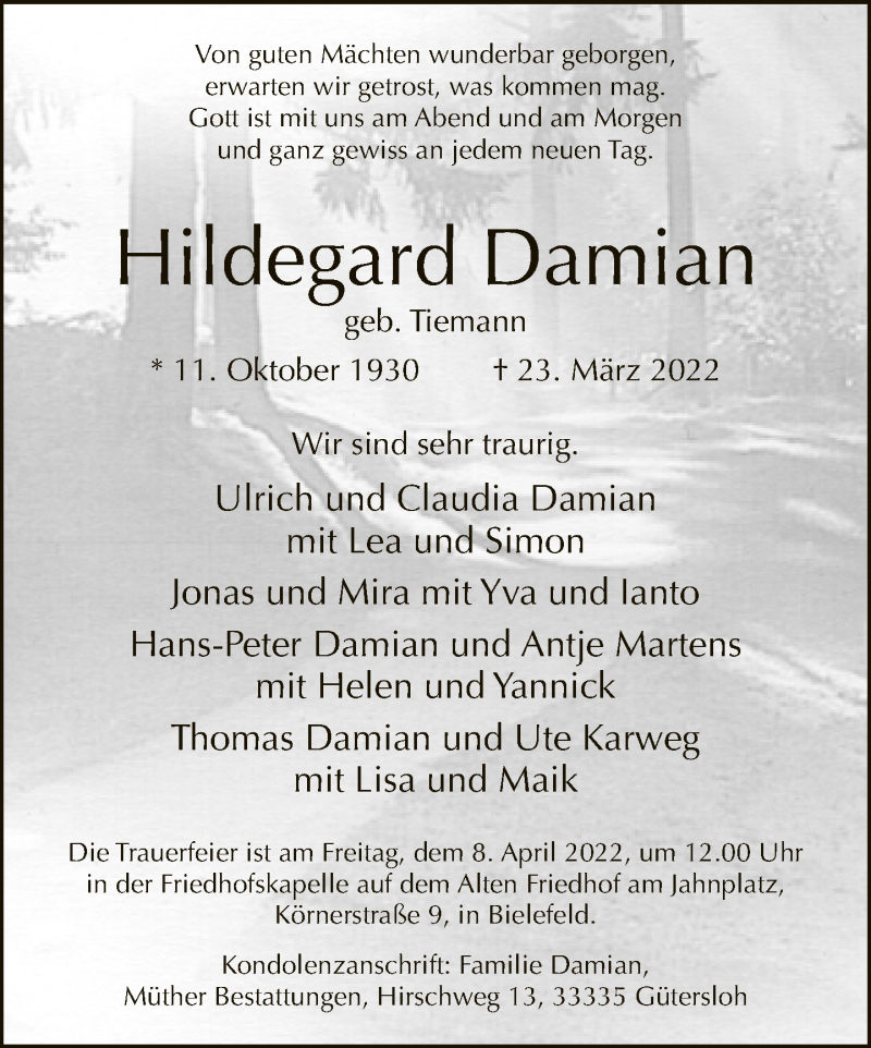 Hier finden Sie alle Traueranzeigen aus der Zeitung, die bisher für Hildegard Damian erschienen sind. Weitere Traueranzeigen, die in der Zeitung erscheinen, werden hier ebenfalls aufgelistet
