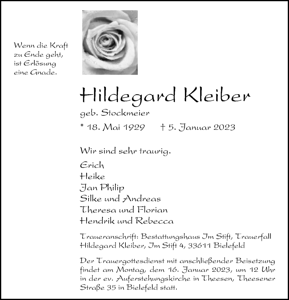 Hier finden Sie alle Traueranzeigen aus der Zeitung, die bisher für Hildegard Kleiber erschienen sind. Weitere Traueranzeigen, die in der Zeitung erscheinen, werden hier ebenfalls aufgelistet