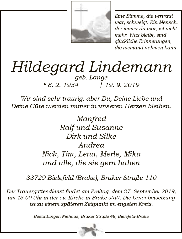 Hier finden Sie alle Traueranzeigen aus der Zeitung, die bisher für Hildegard Lindemann erschienen sind. Weitere Traueranzeigen, die in der Zeitung erscheinen, werden hier ebenfalls aufgelistet