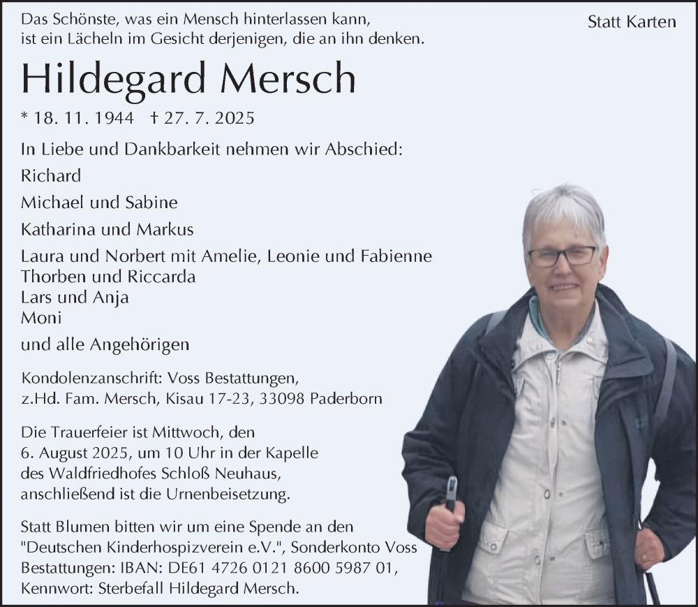 Hier finden Sie alle Traueranzeigen aus der Zeitung, die bisher für Hildegard Mersch erschienen sind. Weitere Traueranzeigen, die in der Zeitung erscheinen, werden hier ebenfalls aufgelistet