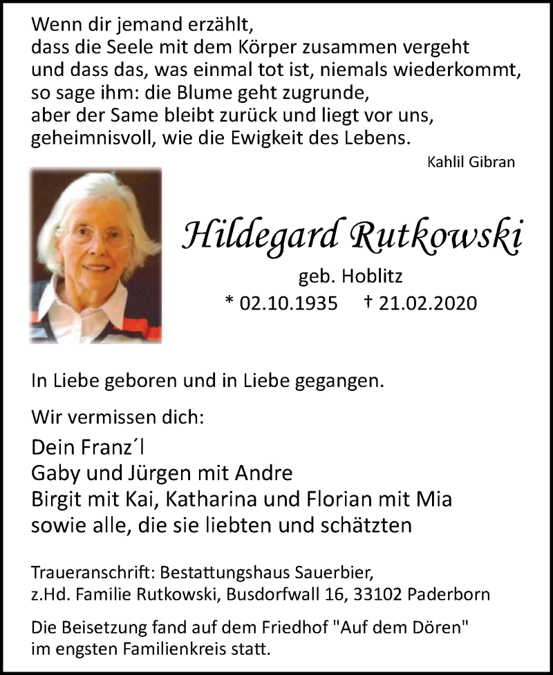 Hier finden Sie alle Traueranzeigen aus der Zeitung, die bisher für Hildegard Rutkowski erschienen sind. Weitere Traueranzeigen, die in der Zeitung erscheinen, werden hier ebenfalls aufgelistet
