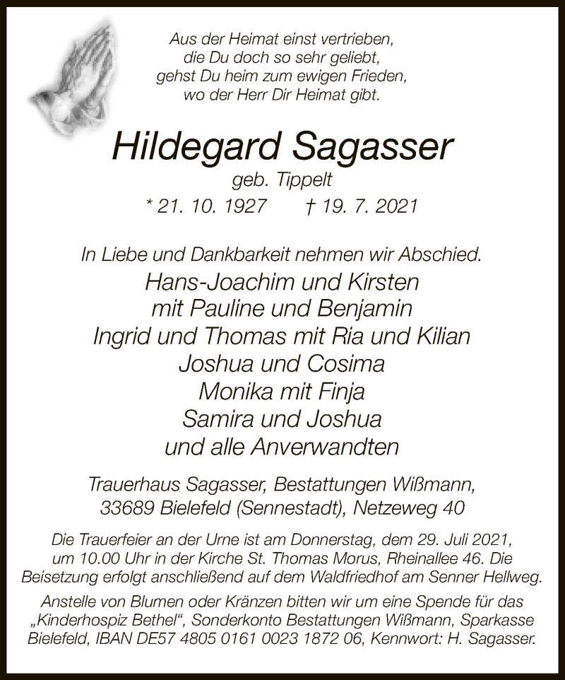 Hier finden Sie alle Traueranzeigen aus der Zeitung, die bisher für Hildegard Sagasser erschienen sind. Weitere Traueranzeigen, die in der Zeitung erscheinen, werden hier ebenfalls aufgelistet
