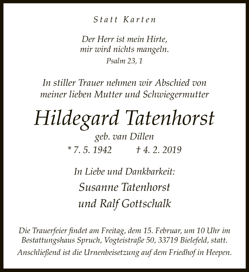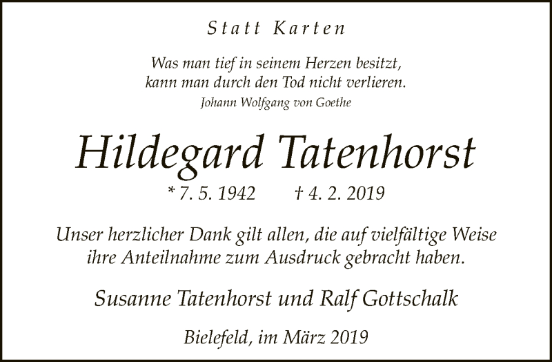 Hier finden Sie alle Traueranzeigen aus der Zeitung, die bisher für Hildegard Tatenhorst erschienen sind. Weitere Traueranzeigen, die in der Zeitung erscheinen, werden hier ebenfalls aufgelistet