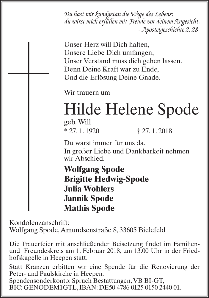 Hier finden Sie alle Traueranzeigen aus der Zeitung, die bisher für Hilde Helene Spode erschienen sind. Weitere Traueranzeigen, die in der Zeitung erscheinen, werden hier ebenfalls aufgelistet