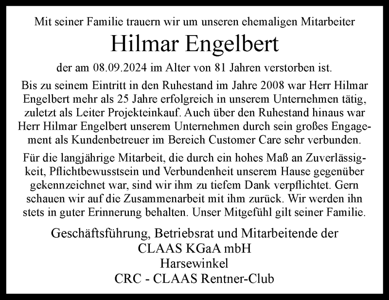 Hier finden Sie alle Traueranzeigen aus der Zeitung, die bisher für Hilmar Engelbert erschienen sind. Weitere Traueranzeigen, die in der Zeitung erscheinen, werden hier ebenfalls aufgelistet