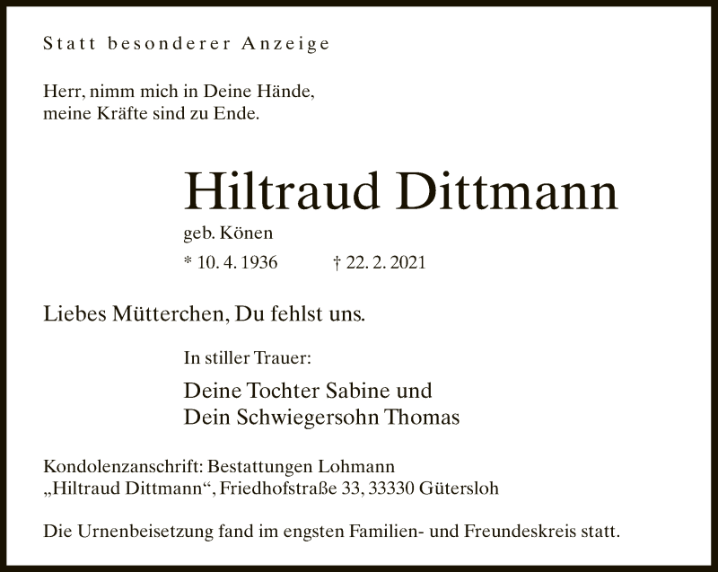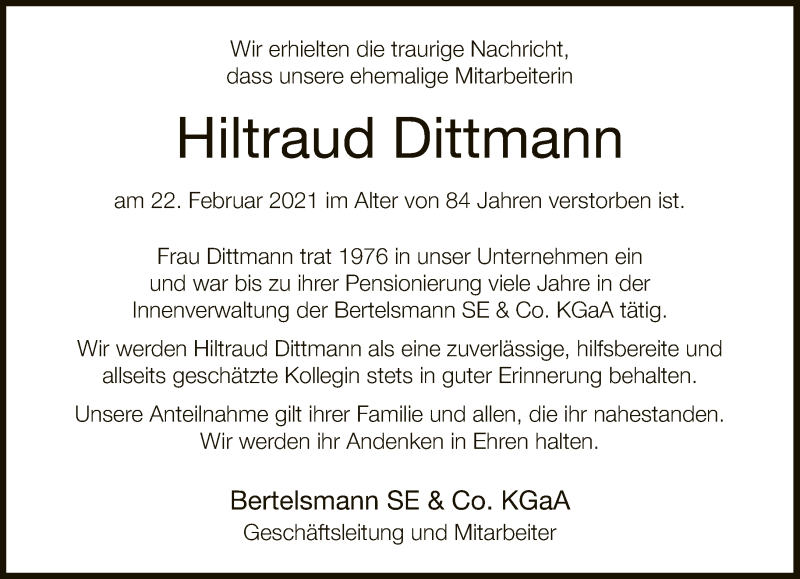 Hier finden Sie alle Traueranzeigen aus der Zeitung, die bisher für Hiltraud Dittmann erschienen sind. Weitere Traueranzeigen, die in der Zeitung erscheinen, werden hier ebenfalls aufgelistet