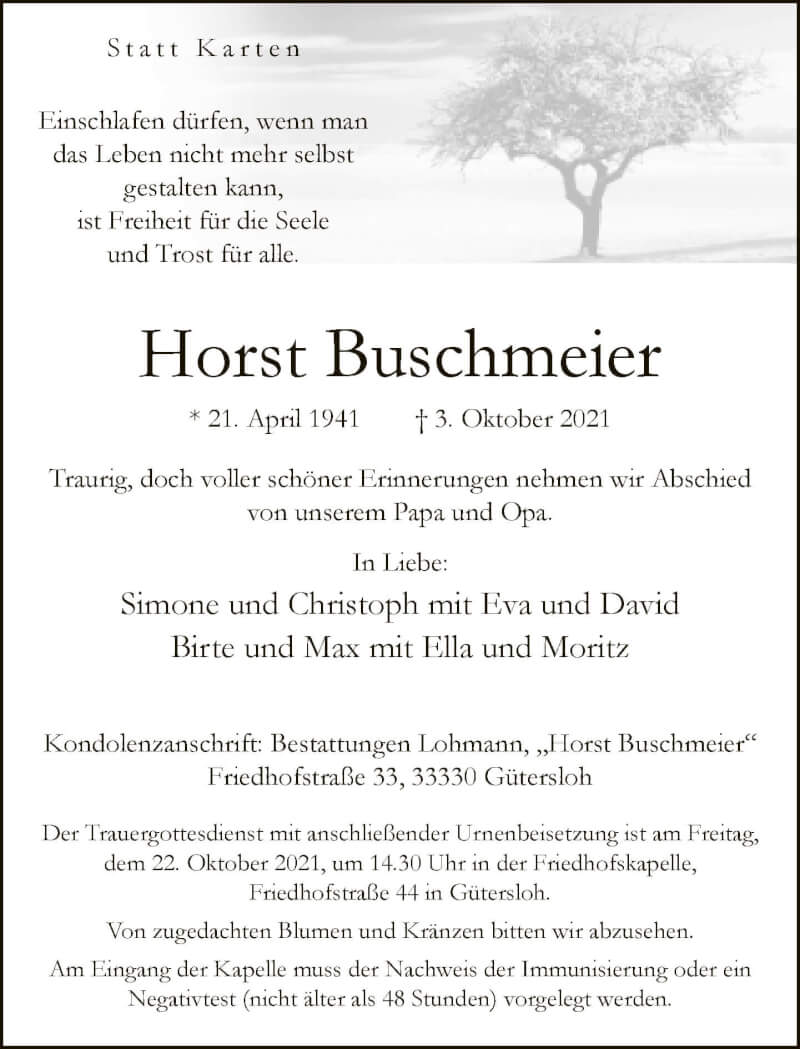 Hier finden Sie alle Traueranzeigen aus der Zeitung, die bisher für Horst Buschmeier erschienen sind. Weitere Traueranzeigen, die in der Zeitung erscheinen, werden hier ebenfalls aufgelistet