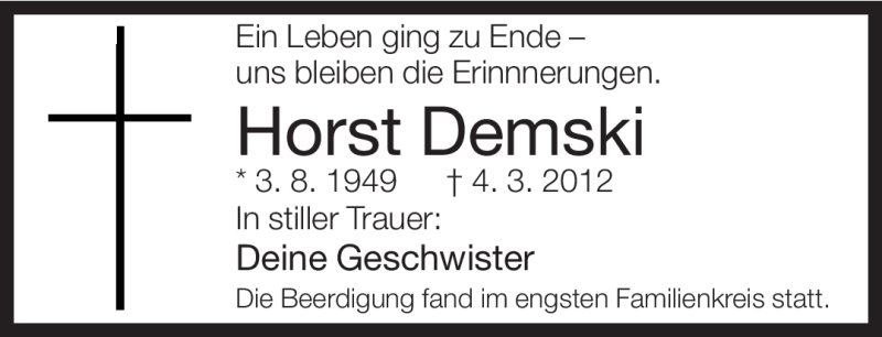 Hier finden Sie alle Traueranzeigen aus der Zeitung, die bisher für Horst Demski erschienen sind. Weitere Traueranzeigen, die in der Zeitung erscheinen, werden hier ebenfalls aufgelistet