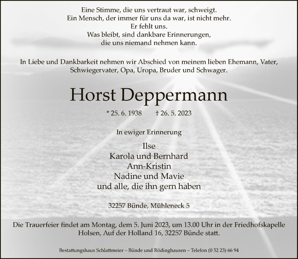 Hier finden Sie alle Traueranzeigen aus der Zeitung, die bisher für Horst Deppermann erschienen sind. Weitere Traueranzeigen, die in der Zeitung erscheinen, werden hier ebenfalls aufgelistet