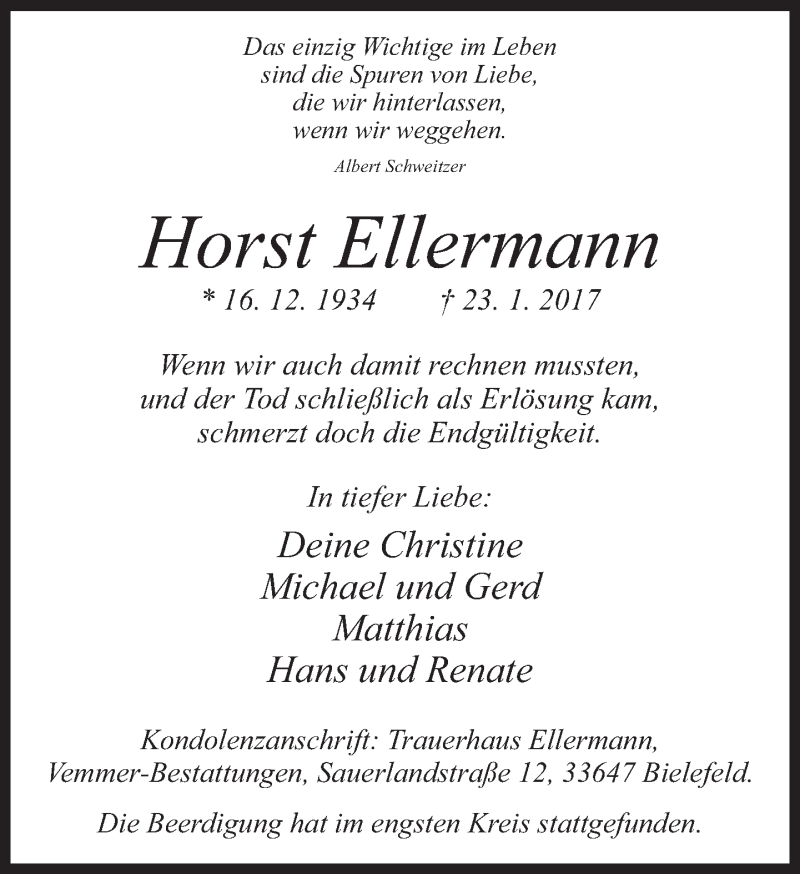 Hier finden Sie alle Traueranzeigen aus der Zeitung, die bisher für Horst Ellermann erschienen sind. Weitere Traueranzeigen, die in der Zeitung erscheinen, werden hier ebenfalls aufgelistet