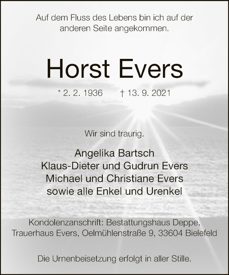 Hier finden Sie alle Traueranzeigen aus der Zeitung, die bisher für Horst Evers erschienen sind. Weitere Traueranzeigen, die in der Zeitung erscheinen, werden hier ebenfalls aufgelistet