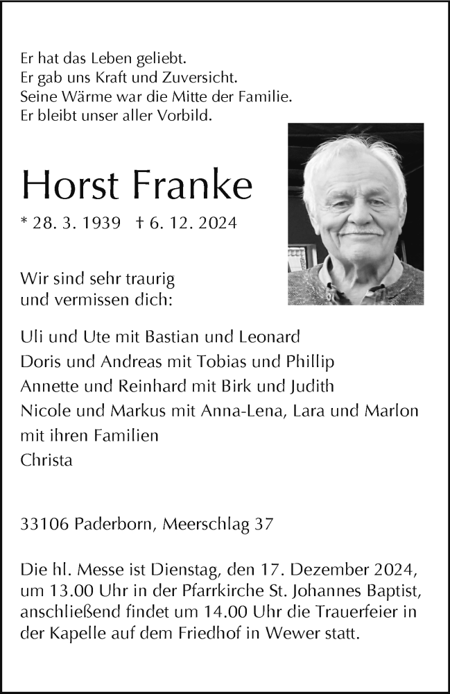 Hier finden Sie alle Traueranzeigen aus der Zeitung, die bisher für Horst Franke erschienen sind. Weitere Traueranzeigen, die in der Zeitung erscheinen, werden hier ebenfalls aufgelistet